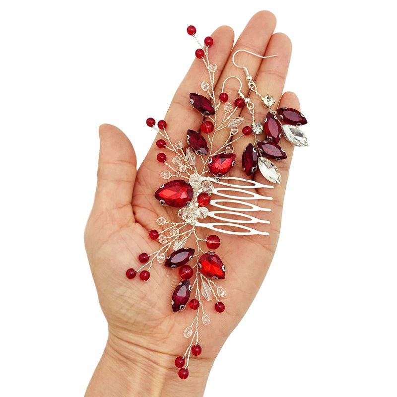 Bridal Crystal Hair Comb and Earrings Set Elegant Bride Wedding Hair Piece Accessories for Women Prom Party Photography (Wine Red)