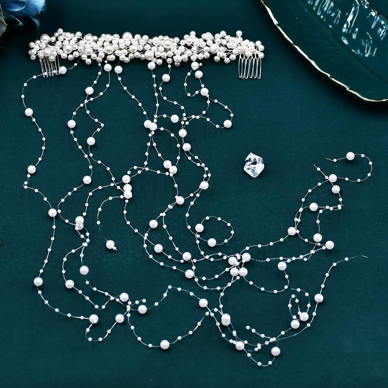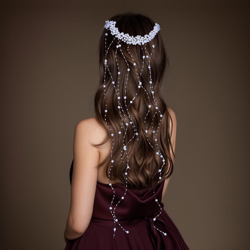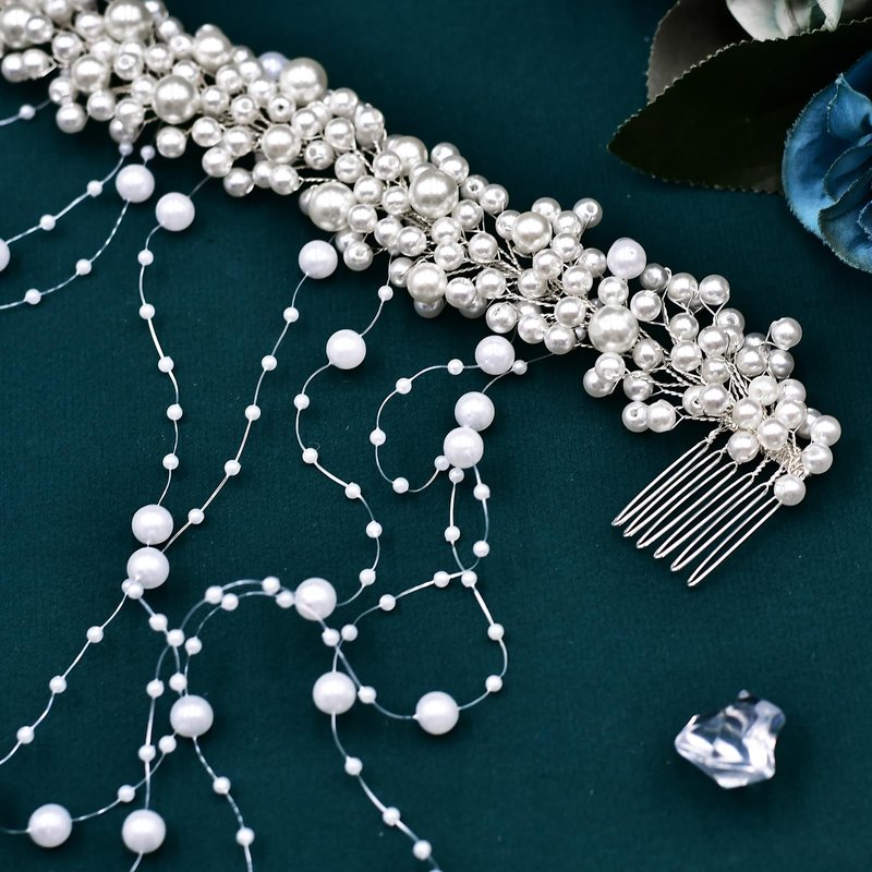 - Pearl Hair Accessories Design: Hair headwear are made of white pearls, pearls of different sizes are inlaid on the hair tiara with copper wire, and the ends of the hair accessories are equipped with hair combs