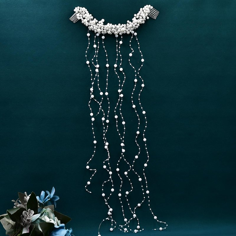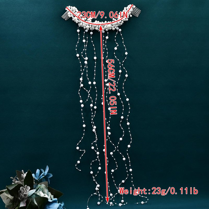 - Hair Accessories Size: Our wedding pearl hair vine is 56 CM/22.05 IN long and 23 CM/9.06 IN wide. The comb uses white pearls and is matched with long tassel hair pieces, which are clearly layered