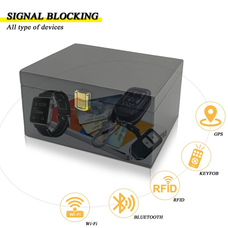 - STYLISH & PRACTICAL - This faraday box is made from the finest materials, externally made with PU leather and internally lined with a premium RF shielding. This stylish and sophisticated box will fit well in any area of your home with a prestigious and elegant feel to it.
