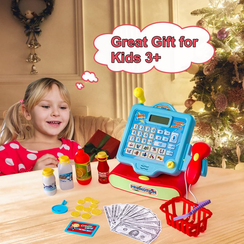 - 【Great Gift for Boys & Girls】: Our kids cash register with scanner has colorful appearance and different kinds of toy accessories, which can meet your kid’s dual needs of playing and learning. This pretend play toy cash register is a great solution for girls and boys over 3 years old on Christmas and birthday!