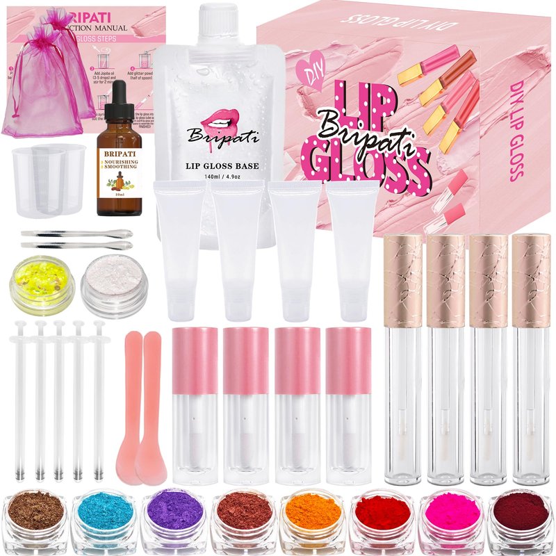 - EVERYTHING YOU NEED: BRIPATI lip gloss making kit comes with everything to craft DIY lip gloss include 140 g Lip Gloss Base, Empty Lip Gloss Tubes, Lip Gloss Pigment Powders, Jojoba Oil, Glitter Powder, DIY tools and instruction manual to make lip gloss