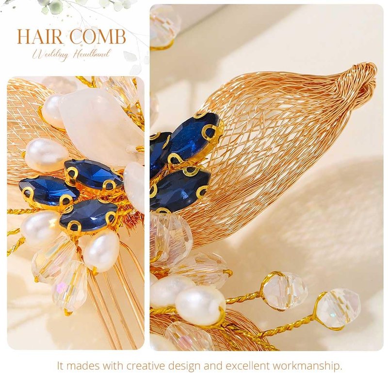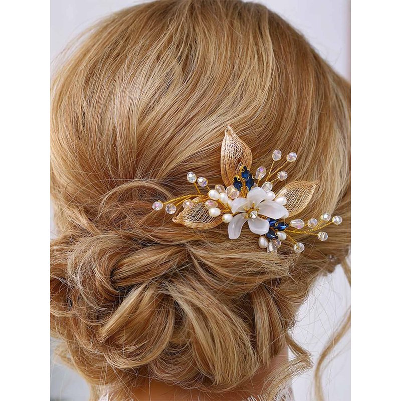 - Gold leaf hair clips are made of crystal, bule rhinestones, leaves, opal with alloy. Prom hair updo won't be fade.