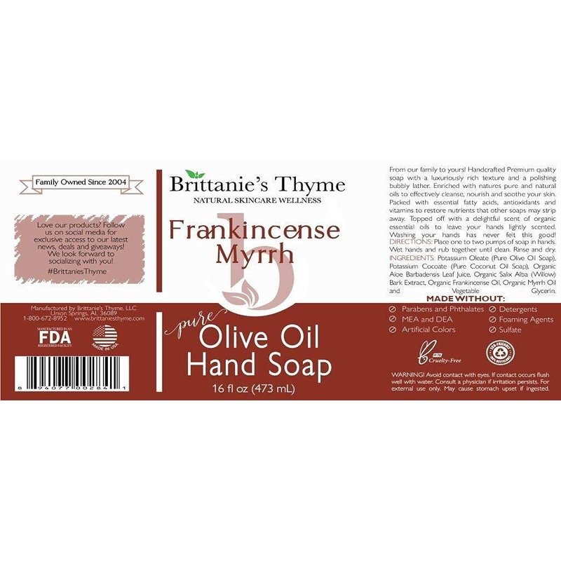 Brittanie's Thyme Organic Natural Hand Soap, 16 oz (Frankincense & Myrrh) Moisturizing Castile Soap Made Olive Oil And Natural Luxurious Essential Oils. Vegan, Gluten & Cruelty Free,