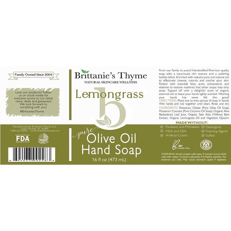 Brittanie's Thyme Organic Natural Hand Soap, 16 oz (Lemongrass) Moisturizing Castile Soap Made Olive Oil And Natural Luxurious Essential Oils. Vegan, Gluten & Cruelty Free,