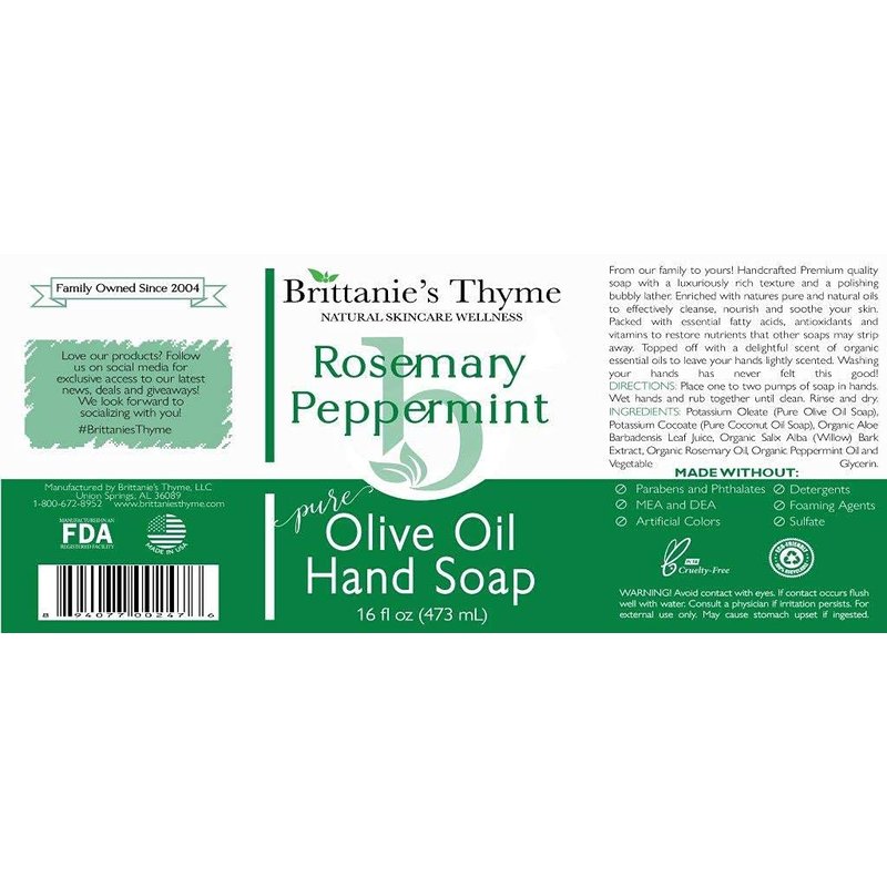 Brittanie's Thyme Organic Natural Hand Soap, 16 oz (Rosemary & Peppermint) Moisturizing Castile Soap Made Olive Oil And Natural Luxurious Essential Oils. Vegan, Gluten & Cruelty Free,