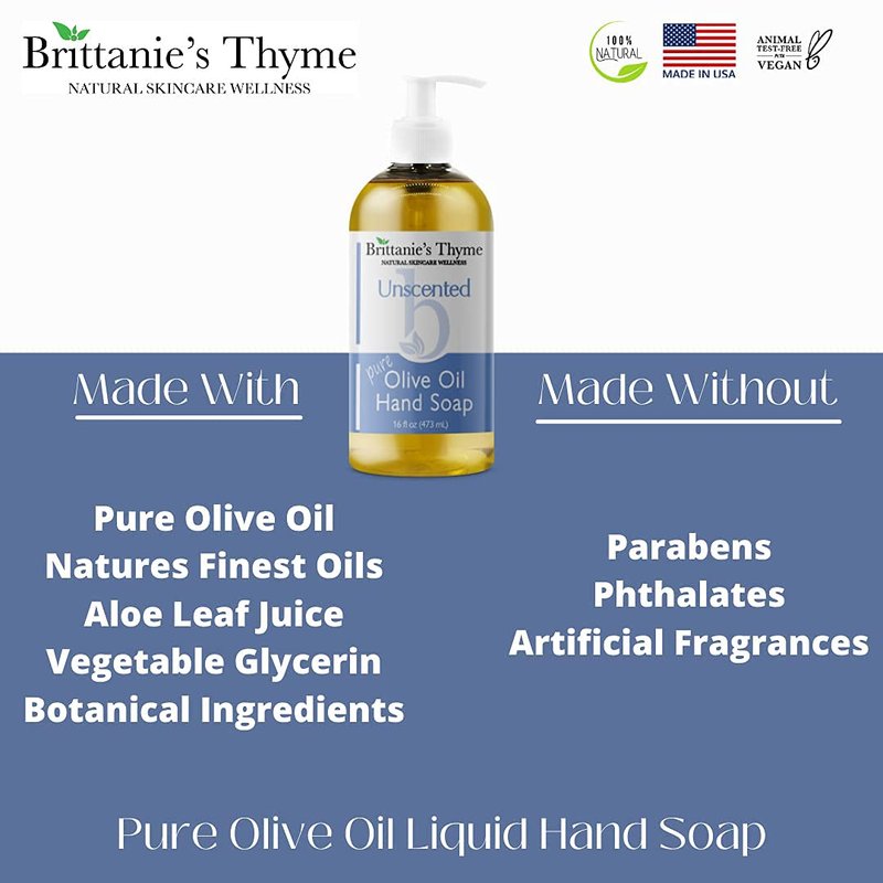 Brittanie's Thyme Organic Natural Hand Soap, 16 oz (Unscented) Moisturizing Castile Soap Made Olive Oil And Natural Luxurious Essential Oils. Vegan, Gluten & Cruelty Free,