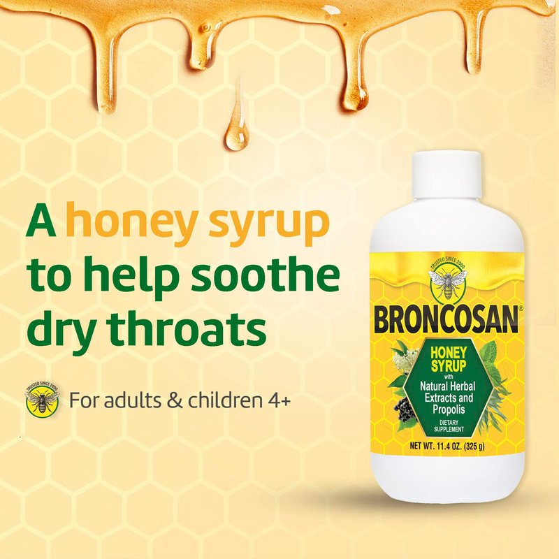 Don’t let a tickly throat ruin your day! Broncosan’s Honey Syrup is a syrup for adults and children ages 4 and up, providing soothing relief from itchy, dry, tickly and uncomfortable throats.