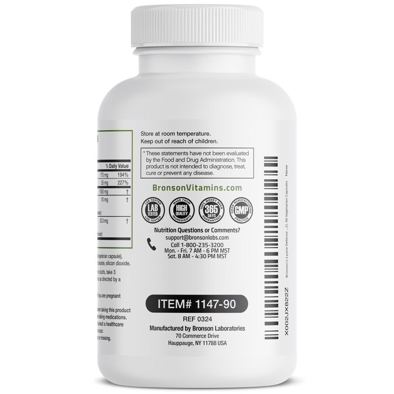 Bronson’s L-Lysine Defense Immune Support Complex provides 1500 mg of L-Lysine plus additional key ingredients to support the immune system.* L-Lysine is an essential amino acid that is obtained through foods and supplementation. It’s thought that L-Lysine helps to maintain normal production of the amino acid L-Arginine. L-Lysine Defense also features natural herbal ingredients Olive Leaf and Garlic, which have been used throughout history in various cultures to support immune health.* Additionally, L-Lysine Defense includes Vitamin C and Zinc to help replenish the body with essential nutrients to help maintain the immune system.* Laboratory tested Non-GMO, Gluten-Free, and Soy-Free, L-Lysine Defense Immune Support Complex is carefully manufactured within our GMP New York Facility.