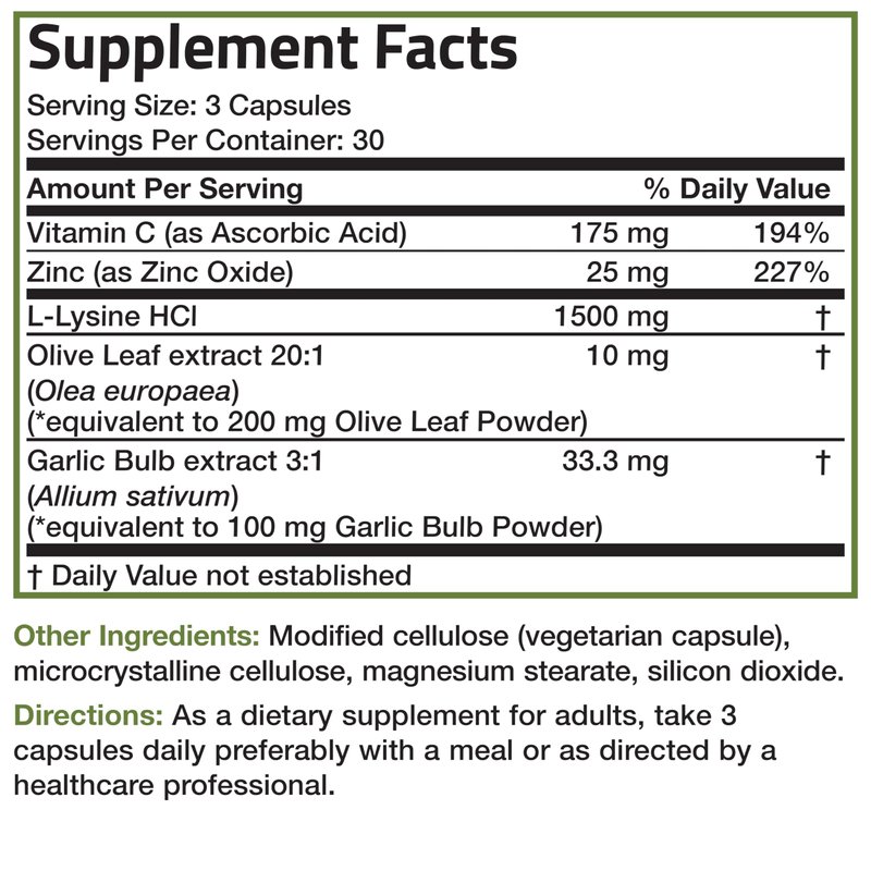 - Plus Olive Leaf, Garlic, Vitamin C & Zinc: L-Lysine combined with key additional immune support ingredients for superior coverage. Combining natural herbal ingredients, such as Olive Leaf and Garlic, which have been used throughout history in various cultures to support immune health.* Additionally includes Vitamin C and Zinc to help replenish the body with essential nutrients to help maintain a healthy immune system.*