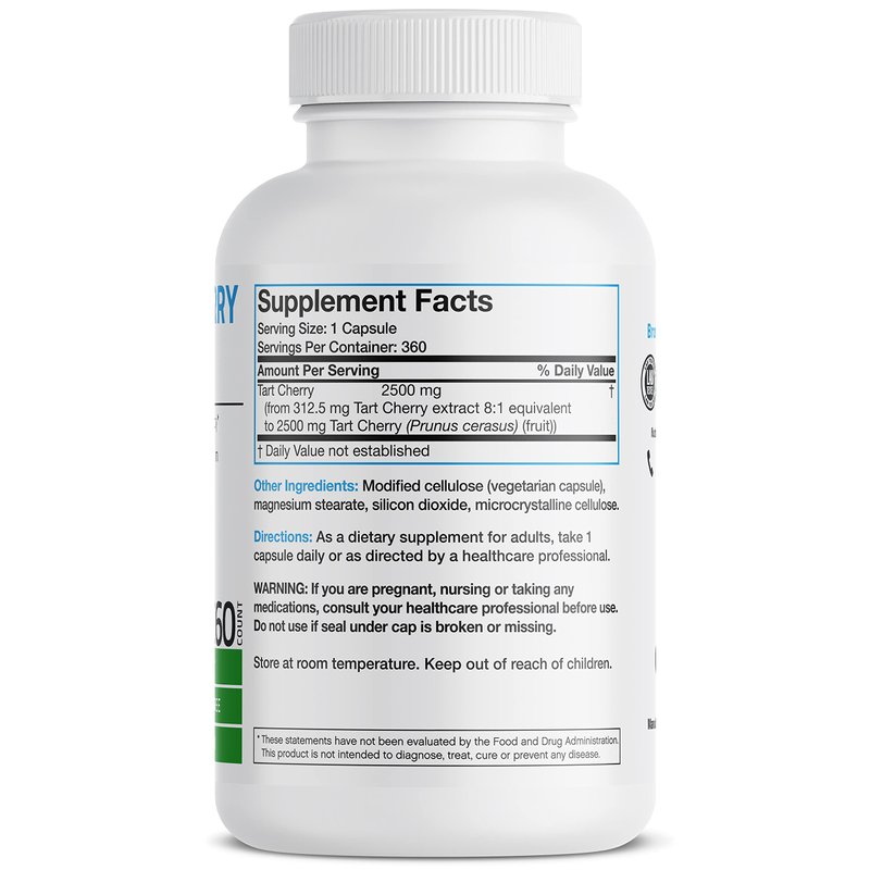 Bronson Tart Cherry 2500 mg. is a vegetarian supplement that features an 8:1 ratio of concentrated tart cherry anthocyanin extract, which is equivalent to 2500 mg. of whole tart cherry fruit. And, Bronson’s Tart Cherry provides all the benefits of tart cherries without the calories or added sweeteners often found in cherry juice.
