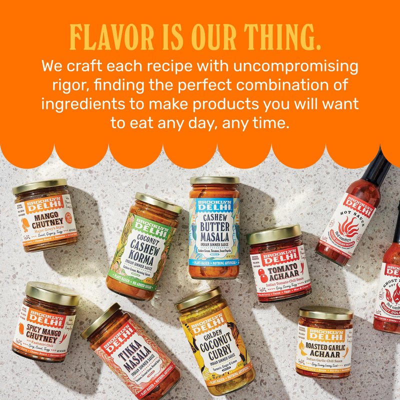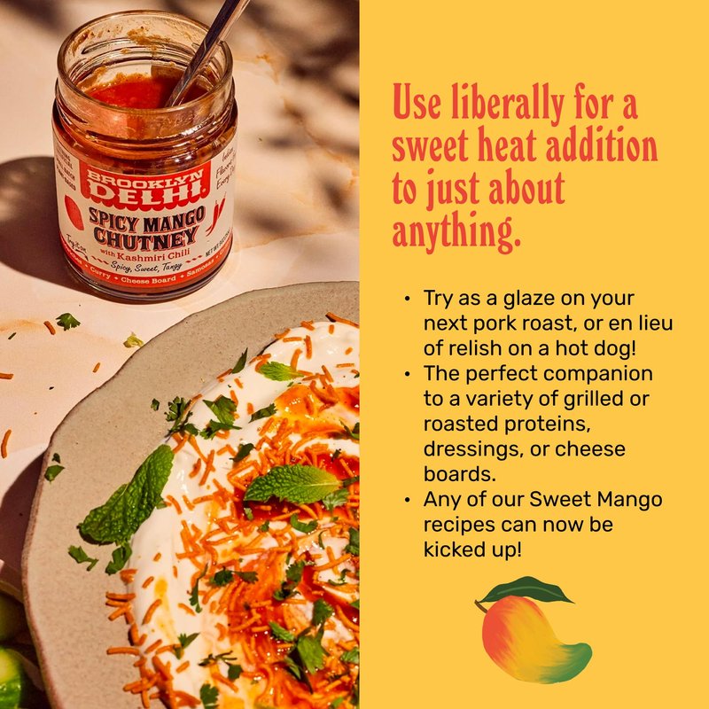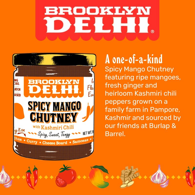 SPICY MANGO CHUTNEY - Our Sweet Mango Chutney features ripe mangoes, fresh ginger and heirloom Kashmiri chili peppers grown on a family farm in Pampore, Kashmir and sourced by our friends at Burlap & Barrel. 50% less sugar than leading brands! HOW TO USE - Use liberally for a sweet heat addition to just about anything. Try as a glaze on your next pork roast, or en lieu of relish on a hot dog! The perfect companion to a variety of grilled or roasted proteins, dressings, or cheese boards. OUR STORY - In a small kitchen in Brooklyn, Chitra and Ben, a cookbook author and an artist, created Brooklyn Delhi to expand the conversation around Indian food in America, bridge cultures by connecting people to real Indian flavors, and create space for a new culinary perspective. Our story is one of identity, flavor, connection, and, of course, love.