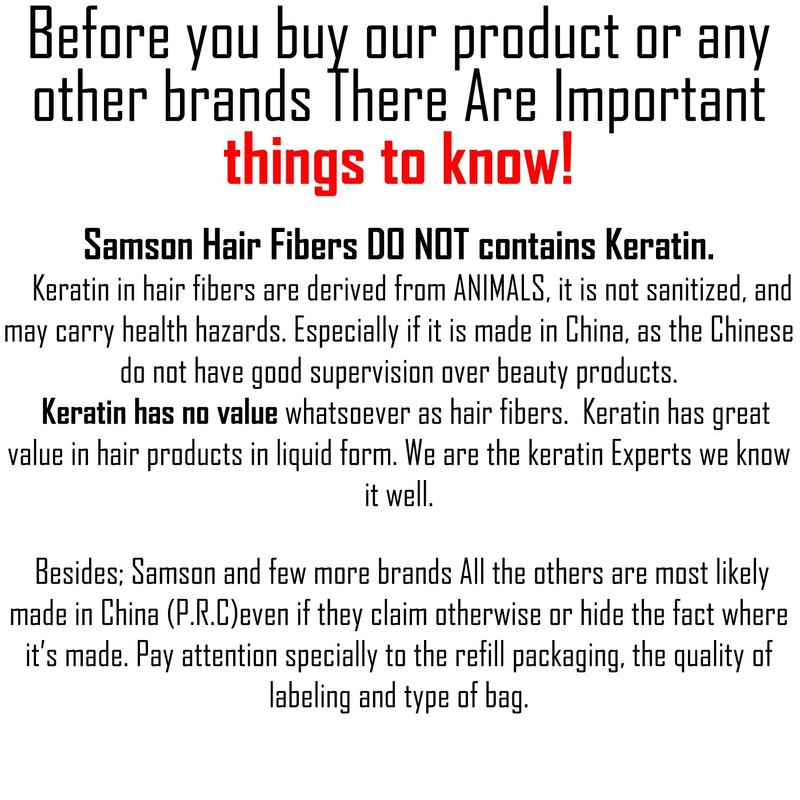 Samson Hair Fibers DO NOT contain Keratin, Why Not?. Keratin in hair fibers are derived from ANIMALS ONLY , it is not sanitized, and may carry health hazards. Especially if it is made in China, as the Chinese do not have good supervision over beauty products. Keratin has no value whatsoever as hair fibers. Keratin has great value in hair products in liquid form. We are the keratin experts, we know it well. How Does It Work? The Hair fibers are precision cut so light and small and then go through an electro-static energizing process. Once they come in contact they get attracted to hair shafts therefore thin hair seem many times fuller and darker due to thousands of tiny fibers clinging to the hair and it appears thicker. Genius idea, yet so simple and safe.