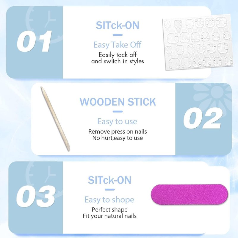 - Get Beautiful Nails Fast: Applying and removing stiletto press on nails artificial nails medium length is very easy and don't need any special tools or skills. You have completely filed your nails before applying organic nails press ons almond shape nails so that they adhere well. If you want to change the design weekly, only using glue is best choice. Adhesive tab is best for a date night or a little event.