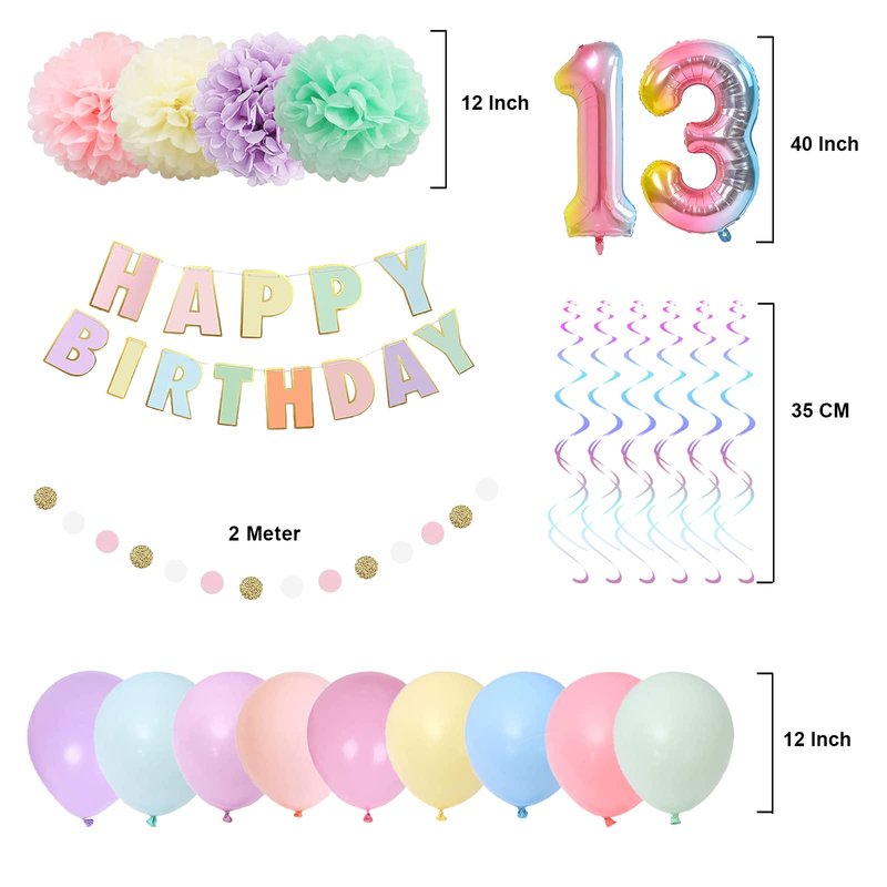 - Great 13th Birthday Decoration Pack: Includes happy birthday banner x 1 set, tissue flowers x 4 , hanging swirl x 6, balloon x 18, paper dot garland x 2meters, number 13 foil balloon.