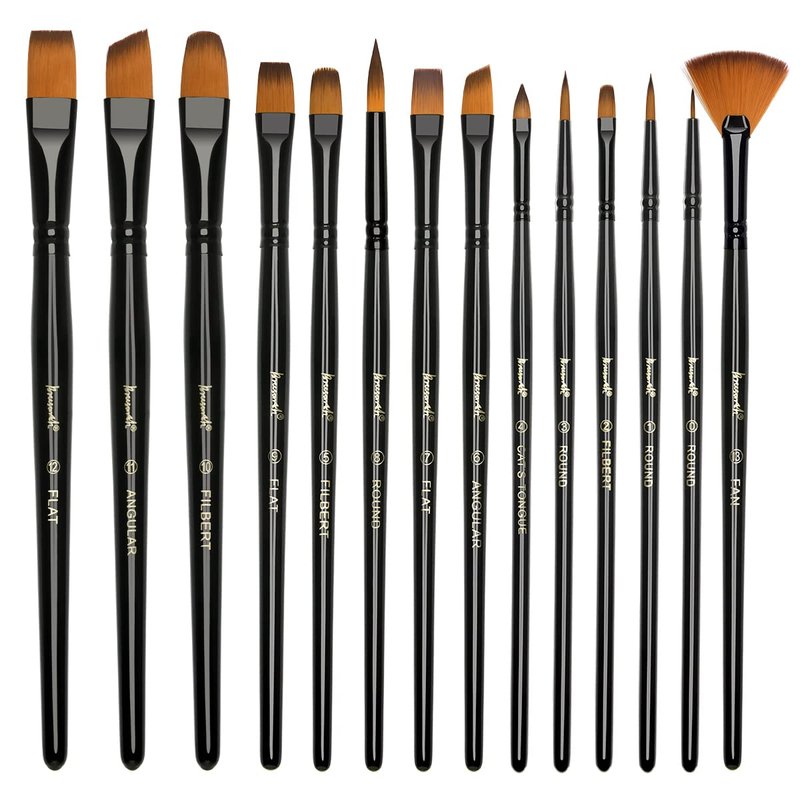 - SET OF 14 OIL AND ACRYLIC PAINT BRUSHES- Whether you're a hobbyist or a professional, This artist paint brush set will help you make gorgeous art! The many shapes and sizes give you plenty of options. The set includes 4 round (no. 0, 1, 3, 8), 2 angular (no. 6, 11), 3 filbert (no. 2, 5, 10), 3 flat (no. 7, 9, 12), 1 cat's tongue (no. 4), and 1 fan brush (no. 13)