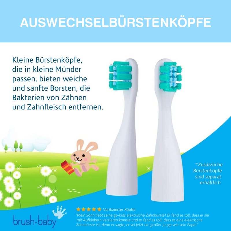Brush-Baby Go-Kidz Electric Toothbrush is a fun way for children to care for their teeth every day and while on sleepovers or on holiday. It comes with a cover that helps keep both brush and suitcase clean and we've included stickers to customize!!! To clean your Go-Kidz: Rinse with water and leave to dry. Ensure the brush is dry before replacing the lid. For best brushing results: Replace every 3 months or when the bristles begin to wear or splay.