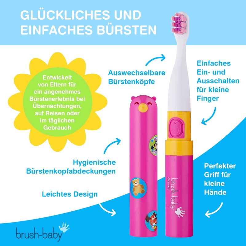 - PACK & GO DESIGN: For sleepovers or vacation, Brush-Baby Go-Kidz lightweight compact design and featured brush head cover that keeps the brush head clean and easy to pack