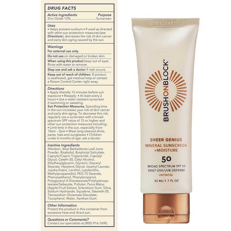 Brush On Block Sheer Genius Mineral Sunscreen plus Moisturizer, SPF 50, UVA/UVB & Blue Light Protection with Hyaluronic Acid, Goes on Sheer, No Residue, Reef Friendly, Vegan, Translucent, 1.7 oz