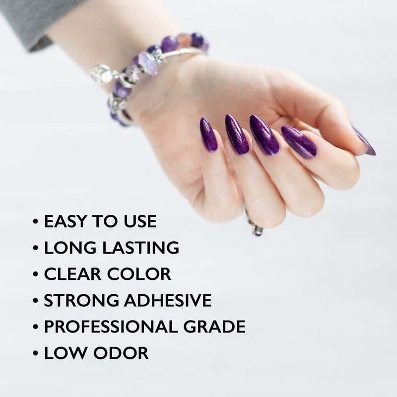 - Our nails glue for nails will hold your acrylic nails on strong. It's brush on, easy to apply and dries fast. The adhesive is tough enough to hold up to everyday wear, yet gentle enough not to cause damage or irritation. Our formula has been tested and approved by many nail techs for its durability and lasting power.
