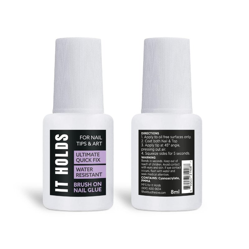 - IT Holds Super Strong Brush on Nail Glue for Acrylic Nails 8ml is perfect for bonding acrylic nails to your own natural nails. It goes on easy, and gives you a strong, durable bond that lasts the life of your manicure. This product offers value because it is easy to use and applies smoothly and holds strong.