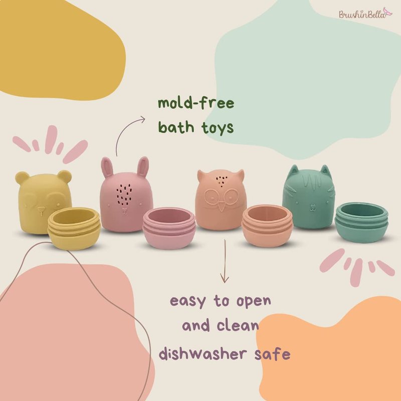 BrushinBella Silicone Bath Toys 4-Pack - Cleanable Silicone Toys with Montessori Stackable Cups - Baby Bath Toys - Dishwasher-Safe Bath Toys - Toddler Tub Toys - Baby Bath Essentials