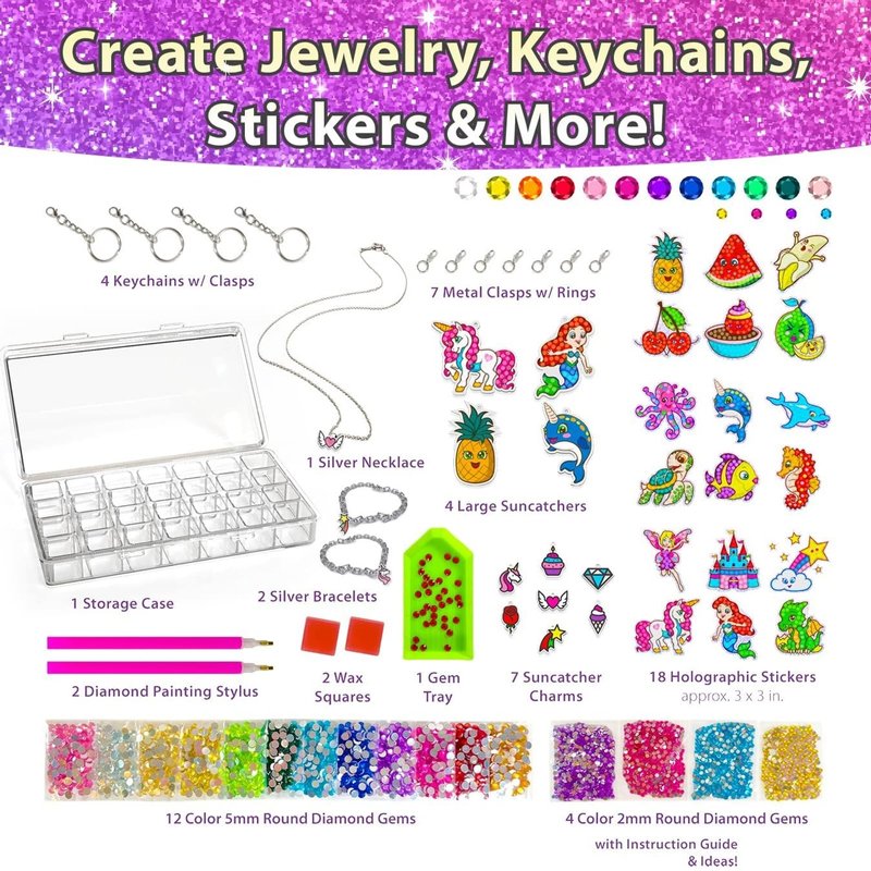 - Mega Gem Art: Bryte Gem Art Diamond Painting set includes 18 hologram stickers, 4 large keychains, 7 jewelry charms, 2 friendship bracelets, and a necklace, so your child can create a variety of fun and unique crafts. The set comes with a storage case with 16 separate containers to keep everything organized, as well as 2 stylus drill pens for sharing, a gem tray, 2 sets of wax squares, and an instruction manual