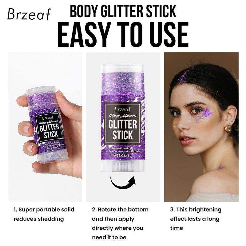- 【Wide Range of Applications】Our purple glitter stick makeup can be used in many applications. For example, music festivals, concerts, birthday parties, stage performances, holiday events and various other occasions. You can in use purple glitter to decorate your face, hair, body, eye shadow and other various parts. Let your makeup shine all over, let the pearlescent illusion hold your beauty.