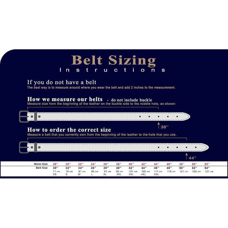 How to measure your Belt size: The best way is to measure around where you wear the belt and add 2 inches to the measurement.Our belts are measured from the fold where the buckle is attached to the middle hole.If you want to get the best size we recommend measuring a belt that works for you from the fold to the hole where you wear the belt.