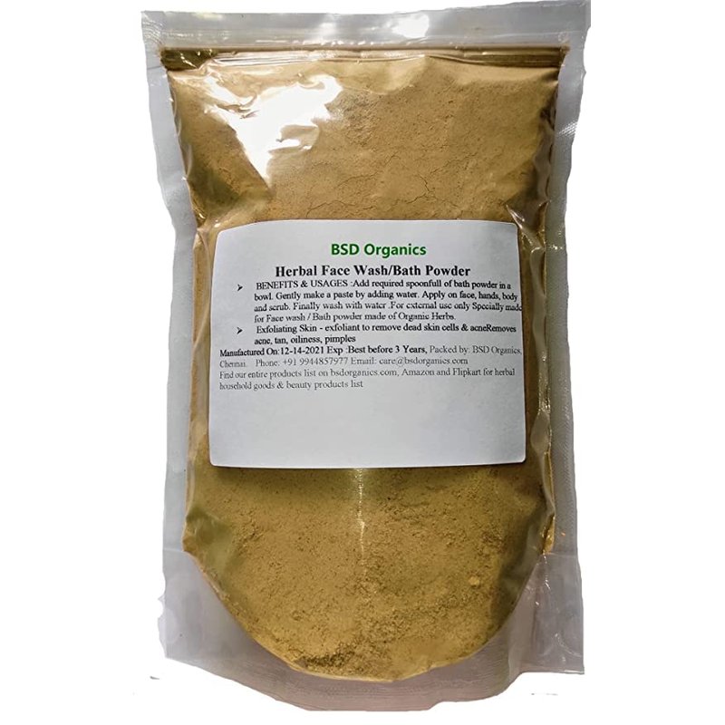 - Natural Face wash / Bath powder made of Green Gram, Besan, Orange, Lemon, Neem & other herbal extracts Usage: Gently make a paste with water and apply on face, hands, body and wash.