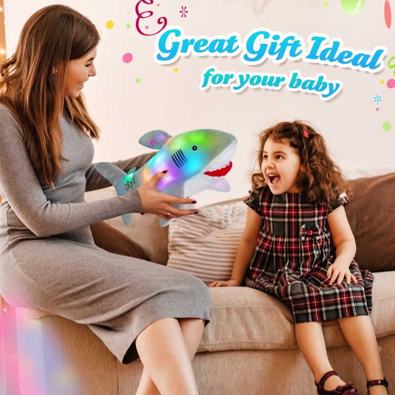 - THOUGHTFUL GIFT FOR KIDS: This glow shark plush toy can be kid’s intimate playmate, it will bring happiness to children. When kids afraid of dark at night, this stuffed animal will accompany them and bring comfort and delight to a kid’s childhood. Kids can also learn more about animals with the help of this shark plush toy.