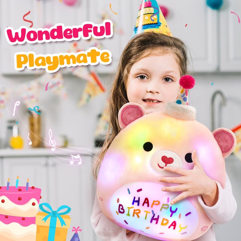 Bstaofy Light up Music Happy Birthday Teddy Bear Soft Plush Pillow Birthday Stuffed Animal Bear Birthday Gift for Toddler Kids Girls, 14''