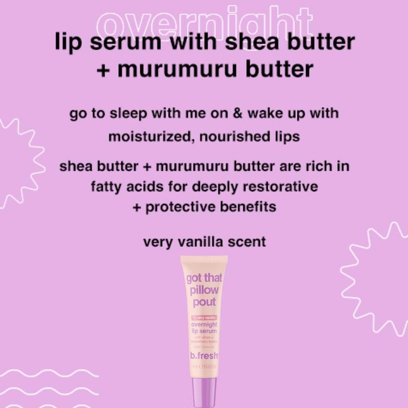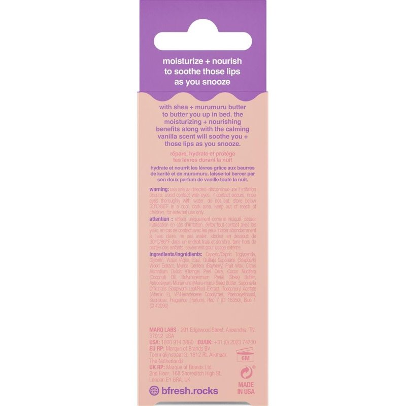 shea and murumuru butter are rich in fatty acids to restore moisture & hydration and lock it in for deep protection and nourishment that lasts aaaall night long. topped off with a calming + comforting vanilla flavor to give you the freshest pillow pout as you snooze.