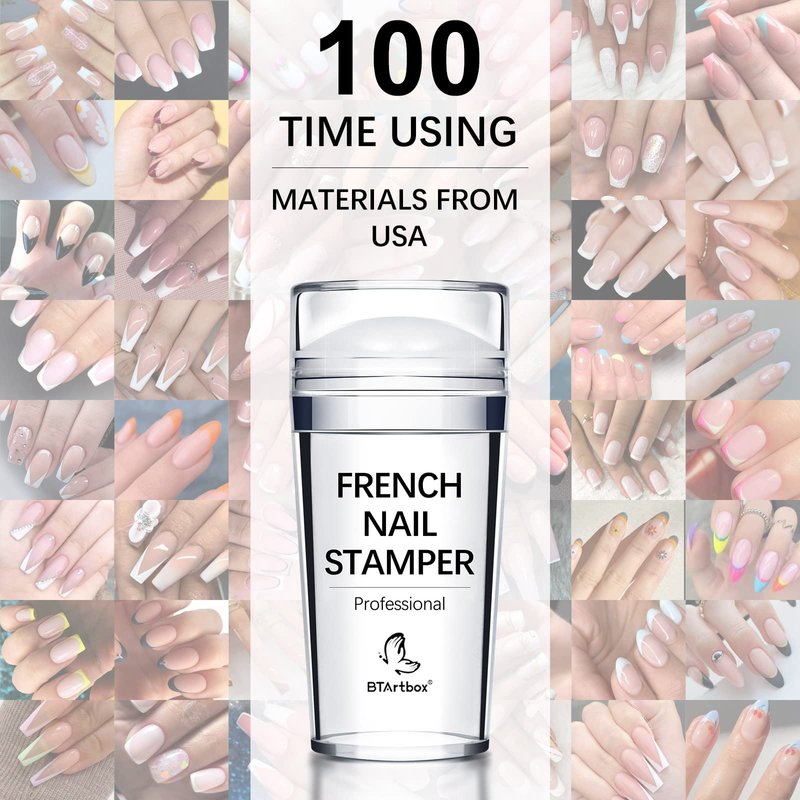 BTArtbox French Nail Stamper - French Tip Nail Tools with Nail Scraper and Replaceable Stamper Head, 100-Time Using Silicone Nail Stamper Kit for Gel Nail Polish DIY Nail Art Tools