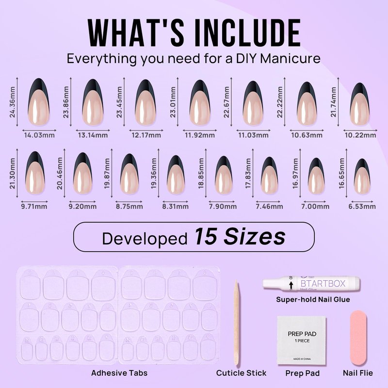 - What's Include: 15 nail sizes ensure a totally custom fit, plus we give you everything needed just in case! Each set comes complete with a storage box, nail glue, adhesive tabs, double-sided nail file, cuticle stick, and prep pad.