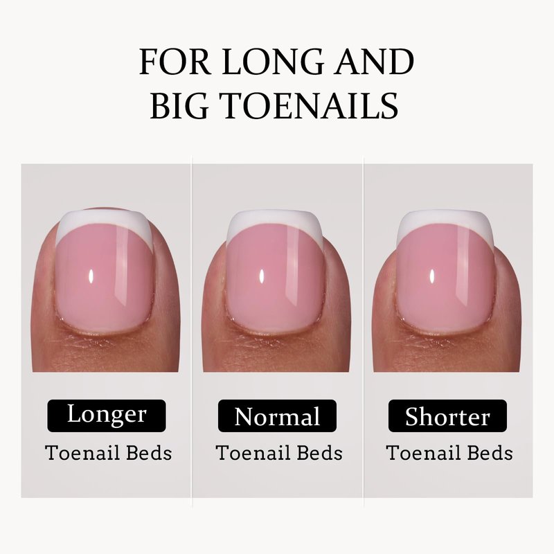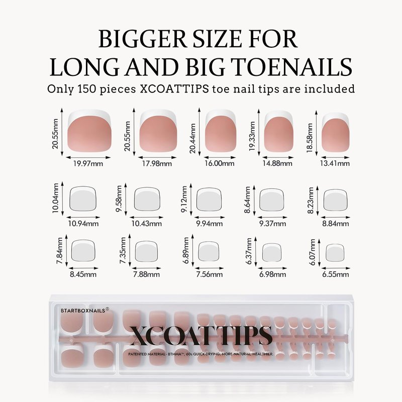 - UPGRADE BIGGER SIZE TOENAIL TIPS: Only 150pcs french tip toe nail tips are included. Upgrade bigger size toenail tips, designed for maximum comfort and style! Just stick them on your toenails with gel glue then apply one layer of builder gel and one layer of top coat and done! DIY toenail art in minutes!
