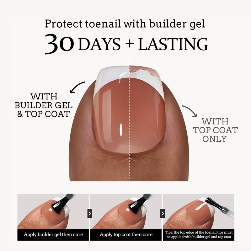 - BEST TOENAIL EXTENSIONS EVER: btartboxnails french gel toe nail tips can last up to 4 weeks with proper application. Meet all your differ needs, press on toe nails, toenail extensions, basic toenail tips no need to apply base gel polish,ideal gift choices.Any problems or questions you have, just contact us via Amazon message center,we will do our best for you to solve them.