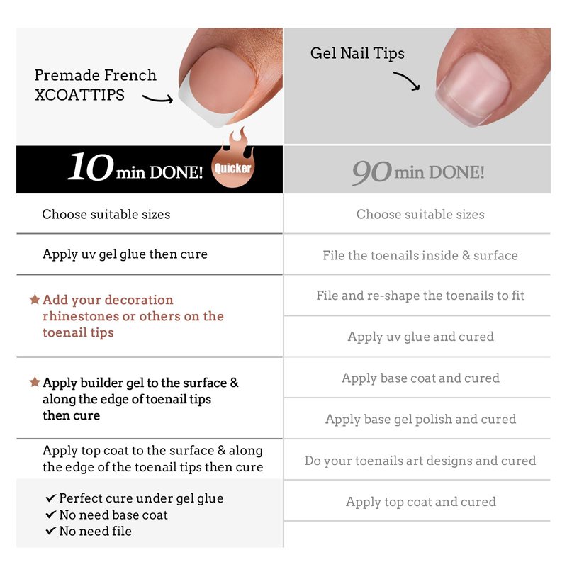 - INNOVATIVE FRENCH TIP DESIGN ULTRA FIT: btartboxnails gel toe nail tips come with french style design and contours to the toenail perfectly from cuticle to free edge. Each toenail tip features a tapered fit towards the cuticle to give you the most natural look! Create a light-cured, pre-shaped nail enhancement in 20 minutes or less ! Save more time and money!