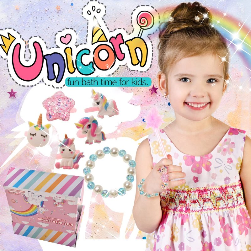 Fizzy Bath with Surprise: Once dropped in water, these bubble bath bombs will fizz, giving water a vibrant color. Kids will love the colorful scented water as well as surprise Unicorn jewelry toys inside: 5 rings and a bracelet. Great bath toys for kids!