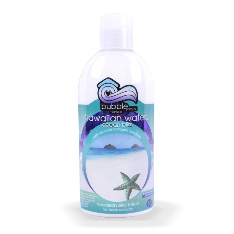 Bubble Shack Hawaii kukui & Shea Hawaiian Silky Lotion is super soft and light weight. It moisturizes all day without feeling heavy and greasy and includes Hawaiian kukui nut oil. Hand stirred with soothing Hawaiian oils plus organic green tea extract and jojoba to heal damaged and sun-kissed skin -Includes sustainably grown and harvested African shea butter. This shea butter lotion provides outstanding protection for the skin. Hawaiian Waters Ocean Bliss: You'll feel like you've taken a plunge into the deep turquoise waters of the Pacific.