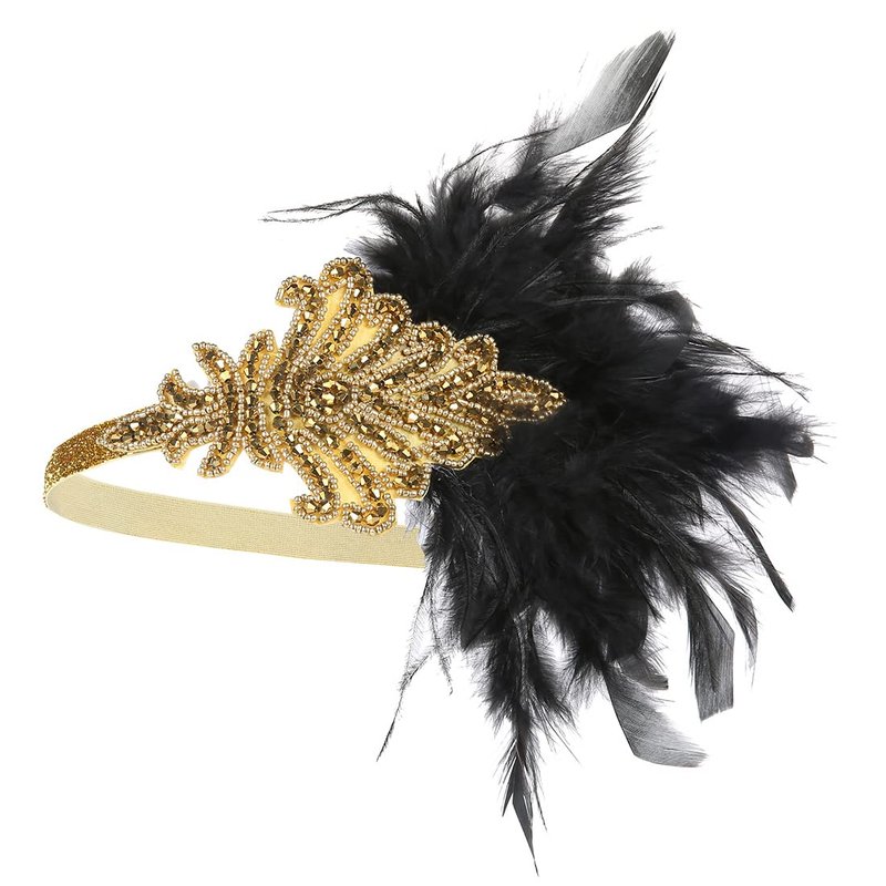 - 【UNIQUE DESIGN】Gold 1920 headband with black turkey feather, decorated with gold crystal rhinestones beads and shining sequins , great choice for Gatsby 20's themed event costume accessories, perfectly match up with your flapper costume