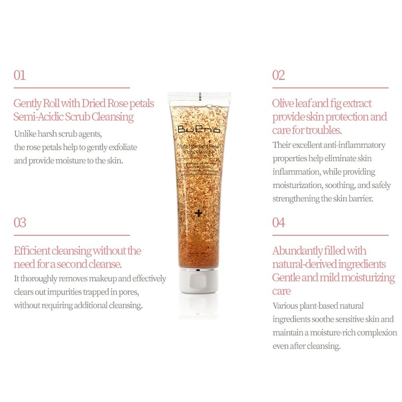 Introducing BUENO+ Pure Moonlight Rose Floral Cleanser, a gentle yet effective facial cleanser that harnesses the power of finest organic ingredients to cleanse, exfoliate, and hydrate your skin. This mild foam cleanser is infused with rose petals, known for their, soothing and rejuvenating properties. Rose petals are rich in anthocyanin which helps slow down skin aging and maintain a youthful look. This floral cleanser effectively removes impurities and excess oil from your skin, leaving it looking fresh, radiant, and revitalized. Its mild pH5.9 acidity helps to balance your skin's pH levels, promoting a healthy and balanced complexion. The hypoallergenic formula is suitable for all skin types, including sensitive skin. To use Pure Moonlight Rose Floral Cleanser, simply apply a proper amount to your skin with dry hands, then wet your hands with water and massage it into your skin in circular motions. Rinse thoroughly with warm water and pat dry. Use twice daily after removing makeup. With its refreshing and floral scent, Pure Moonlight Rose Floral Cleanser is a delightful addition to your skincare routine.