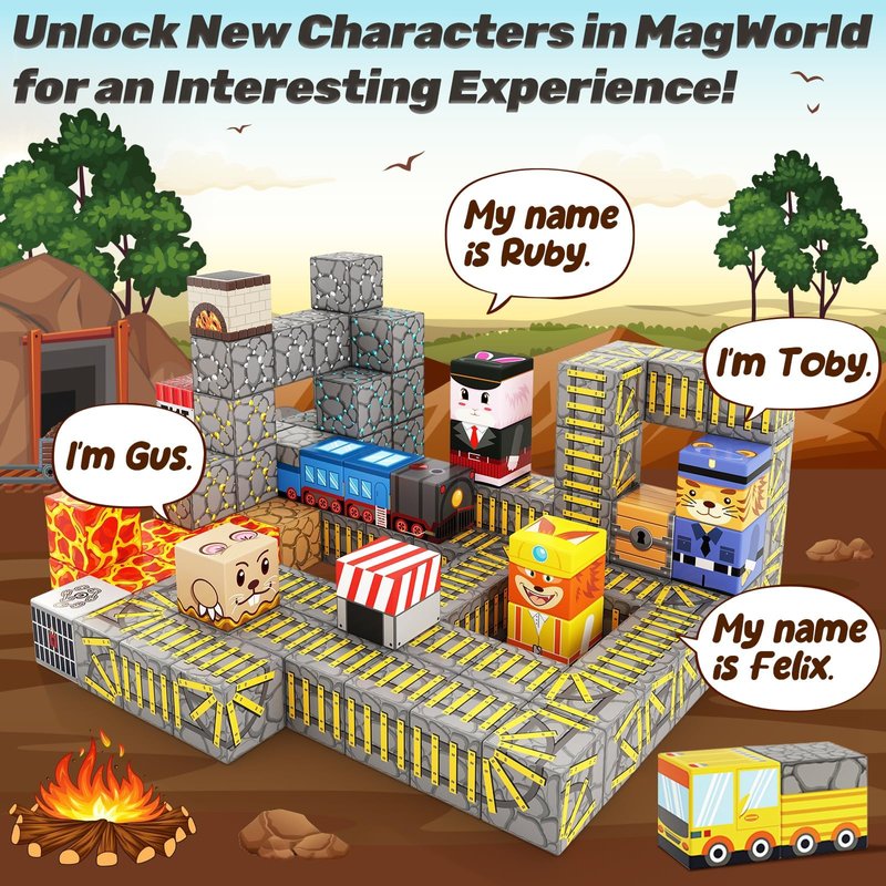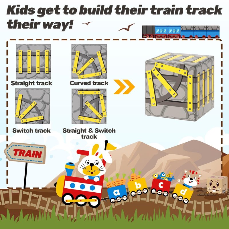 - 【EXCITING MINE TRAIN TRACK ADVENTURE】This set includes track blocks, lava, trucks, etc. The track blocks come in various directions, including straight roads and multi-directional curves, allowing kids to use their creativity and imagination to build intricate underground tracks. They will also meet 4 charming friends: Groundhog Miner, Rabbit Conductor, Fox Worker, and Tiger Cop. Join in on the fun journey now!