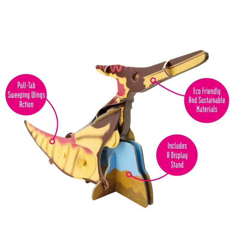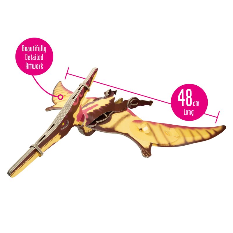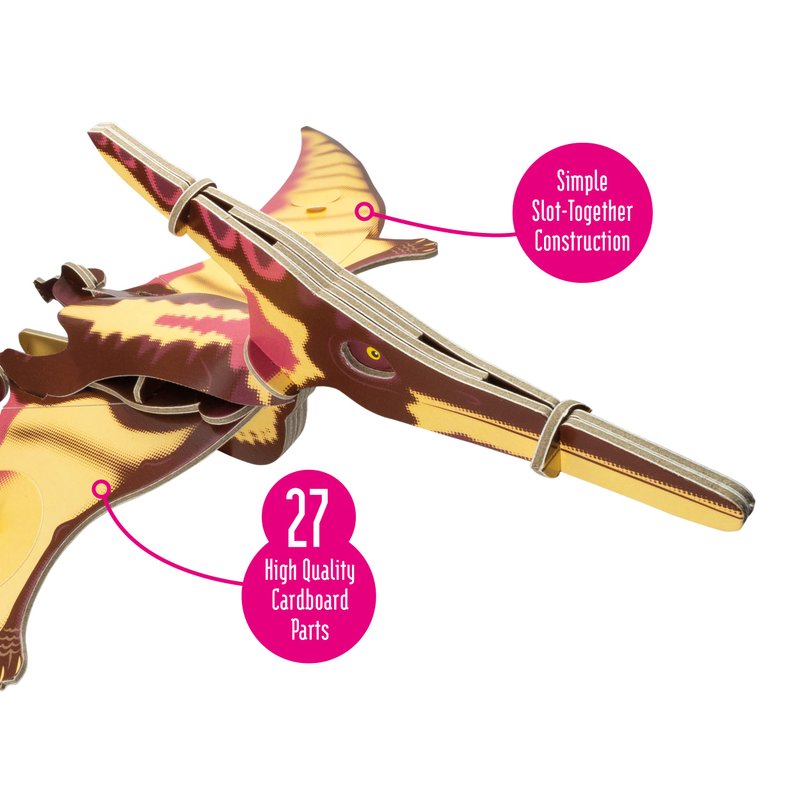 - CONTAINS – 27 pieces. Simply press out the colourful cardboard and paper detailed parts, follow the instructions to assemble and construct your 3D moving kit by slotting together to form your very own true-to-life Pteranodon. No glue needed! Contains a fact stand helping children understand more details about this extinct prehistoric Pteranodon and its outdoor habitat.