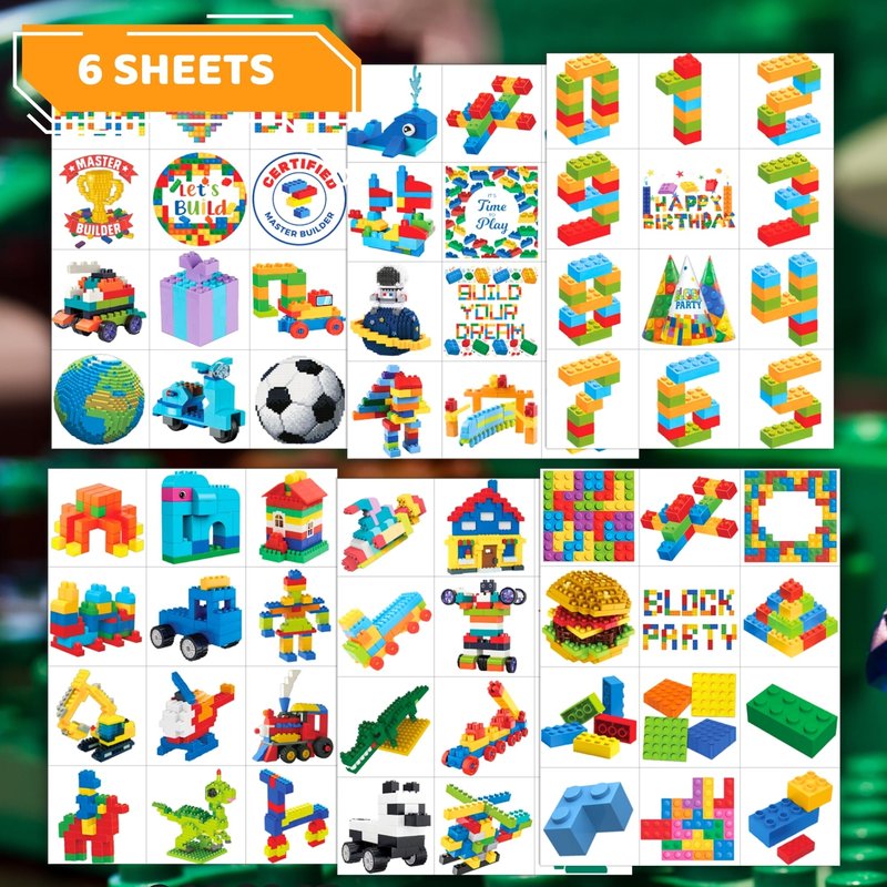 - 💙BUILDING BLOCK TATTOO SET: Each building block tattoos set includes a total of 6 sheets. There are 72 super cute separate tattoos, for example cars, construction vehicles, cities, architecture, trains, boats, airplanes, space, houses, tree, animals, numbers, food, etc