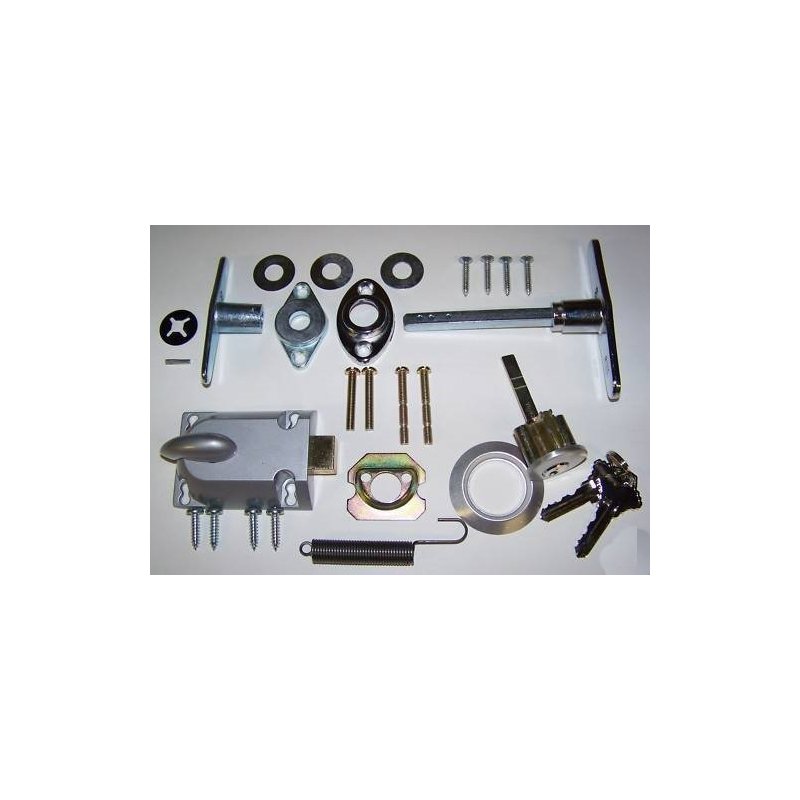 LOCK CYLINDER AND HANDLE SET INSIDE & OUTSIDE T HANDLE INSIDE & OUTSIDE MOUNTING BRACKETS SHIMS SCREWS DRIFT PIN PUSH NUT DIE CAST DEAD BOLT 2 KEYS ALL HARDWARE AND FASTENERS RETURN SPRING COMPLETE ASSEMBLY SEE SECOND IMAGE SEE OUR STORE FOR MORE GARAGE DOOR LOCKS WE HAVE A FULL LINE OF GARAGE DOOR LOCKS IN OUR STORE UNDER LOCKS ALL PARTS ARE NEW We ship 6 days a week All questions welcome and we will answer via E Mail Thank you !