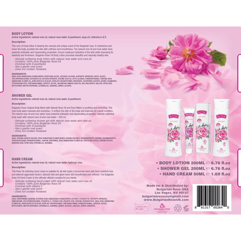 Bulgarian Rose Oil Moisturizing Body Care 3 Piece Gift Set - Natural Rose Body Lotion, Natural Rose Body Wash, Natural Rose Hand Cream