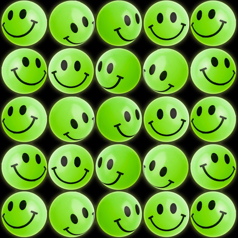 - BULK PACK OF 24 - SMILE BOUNCE BALLS: Our bulk pack of neon rubber bouncy balls are bright, colorful and have a happy smile face. They're very bouncy, measure 1-inch/27mm in diameter, glow in the dark, fun play with worry-free. When one gets lost, just grab another one. Bulk bouncy balls arrive in a sealed poly bag