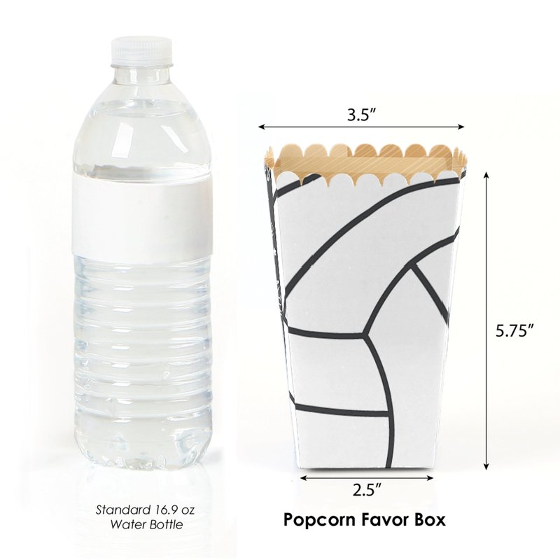 - Volleyball party favor popcorn treat boxes SIZE 5.75 inches tall x 3.5 inches square at the top. The unique design and large size makes these 12 bump, set, spike popcorn boxes a must-have for any baby shower or birthday party.