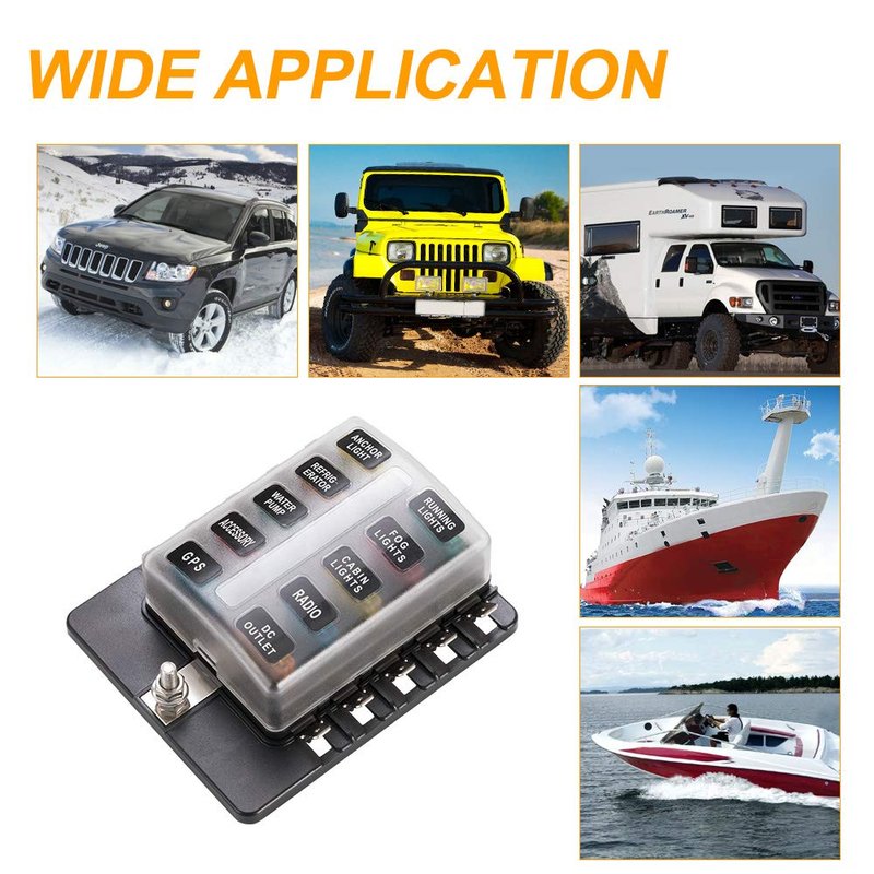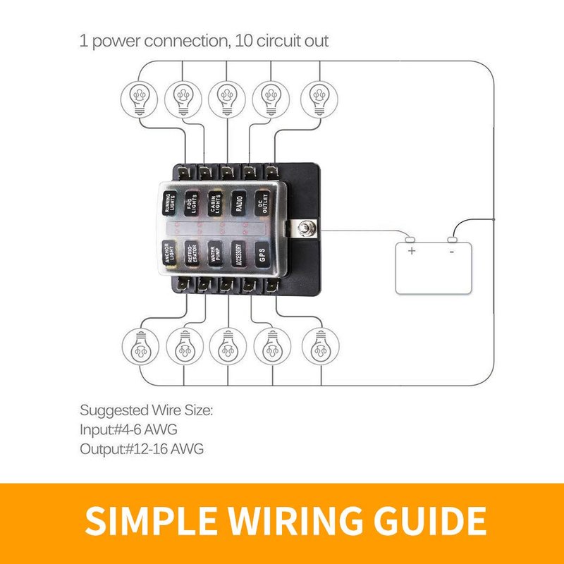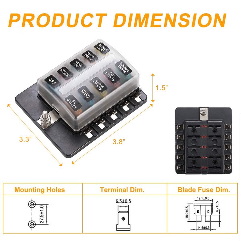 - PACKAGE INCLUDE---1Pcs 10-Way Fuse Box Holder,1Pcs DIY Sticker,20Pcs Blade Fuses: 5A x 2, 10A x 4, 15A x 4, 20A x 6,30Ax 2,40Ax 2. Note: This box holder is suitable for standard blade fuses(ATO/ATC).Please check the size or shape of fuse before purchasing.